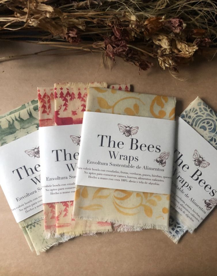 Nuestros wraps están hechos con 100 % cera de abeja opérculo (la cera que recubre las celdas del panal) telas 100 % algodón, estampadas a mano con pinturas no toxicas.